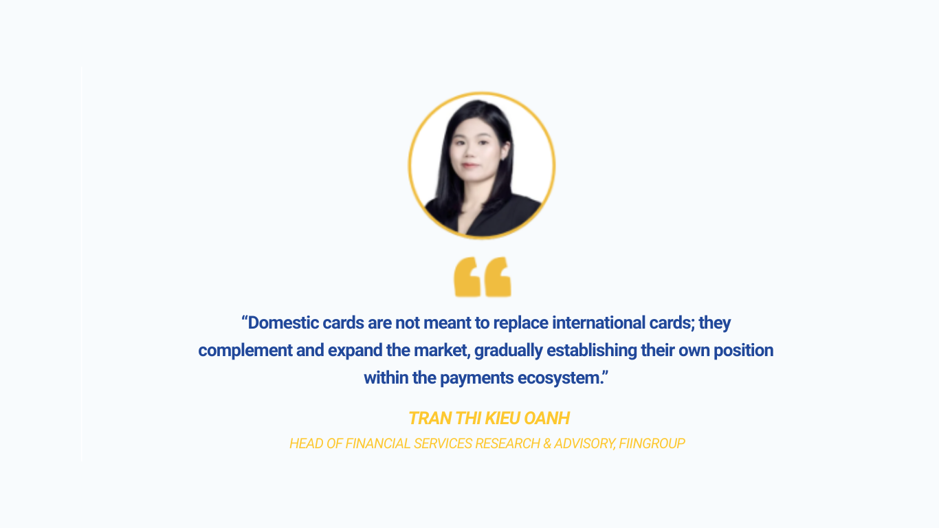 According to Tran Thi Kieu Oanh, Head of Financial Services Research & Advisory at FiinGroup, Vietnam’s card landscape is a vibrant arena where international networks and domestic rails coexist. Global brands still dominate with their broad acceptance, cross-border connectivity, and e-commerce integration, while domestic credit cards offer lower costs and mass-market reach.