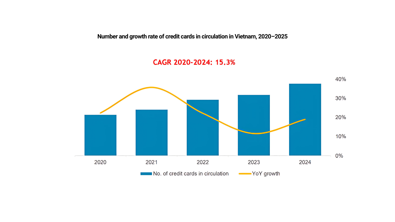 According to a recent analyst report, Vietnam’s credit card market is surging from a relatively low base. Cards in circulation reached 13.1 million in 2024, nearly double the 2020 level, translating to a compound annual growth rate (CAGR) of 15.3%, far outpacing the regional average.
